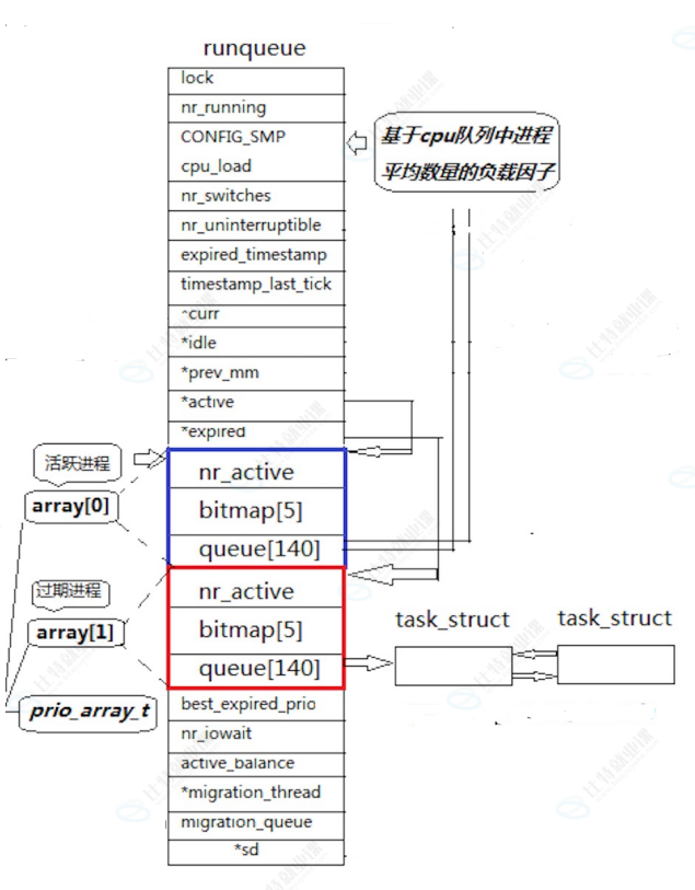 ⏩️每个CPU都有一个调度队列:struct runqueue{};如下图: