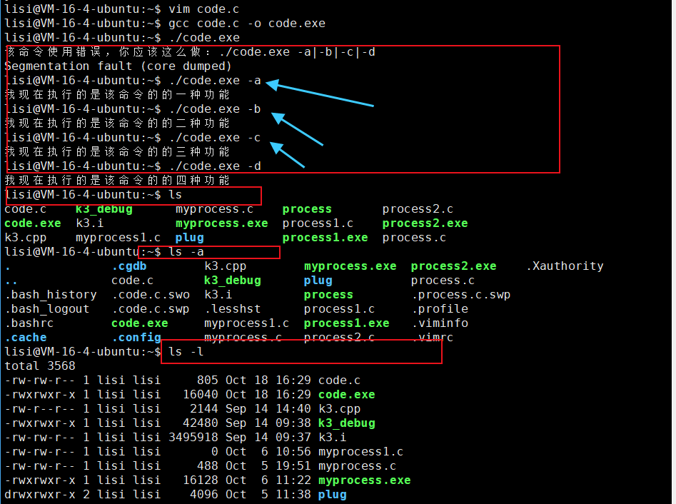 {if(argc != 2){printf("该命令使用错误,你应该这么做:%s -a|-b|-c|-d\n",argv[0]);}if(strcmp(argv[1],"-a") == 0){printf("我现在执行的是该命令的的一种功能\n");}else if(strcmp(argv[1],"-b") == 0){printf("我现在执行的是该命令的的二种功能\n");}else if(strcmp(argv[1],"-c") == 0){printf("我现在执行的是该命令的的三种功能\n");}else if(strcmp(argv[1],"-d") == 0){printf("我现在执行的是该命令的的四种功能\n");}else{printf("我现在执行的是该命令的的默认种功能\n");}return 0;