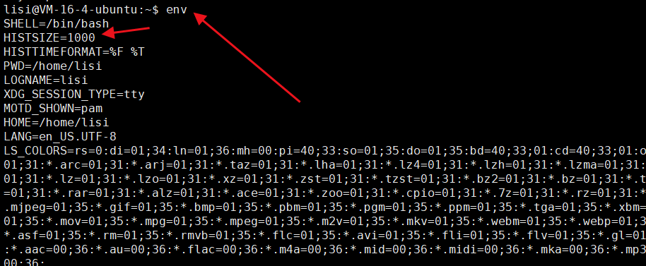 ⏩️其中的 HISTSIZE 的环境变量默认的值是1000,表示记录我们最近输入的 1000 条指令,就像我们平常按下那个箭头向上的键,可以找到历史命令一样。