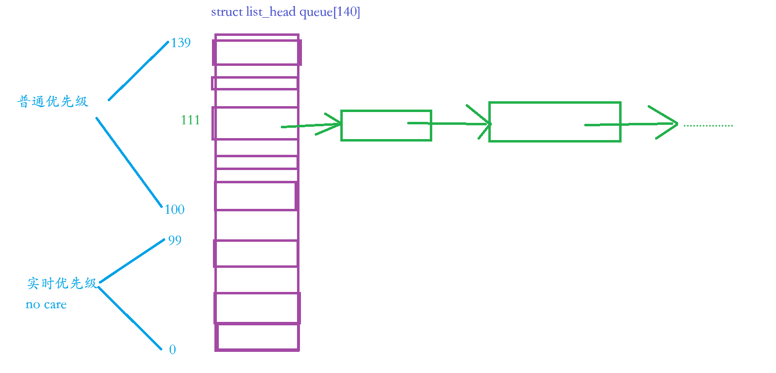 ⏩️这个队列中有个queue[140],类型是struct list_head queue;它前数组下标0到99我们是不关心的,因为他是实时优先级,后面100到139,是普通优先级,对应的优先级的梯度,优先级的范围是:[ 60 , 99 ],60+40 = 100这不就是数组的下标吗,还有 99 + 40 = 139 这就是数组的下标。所以优先级数字本质上是 queue 数组的下标。