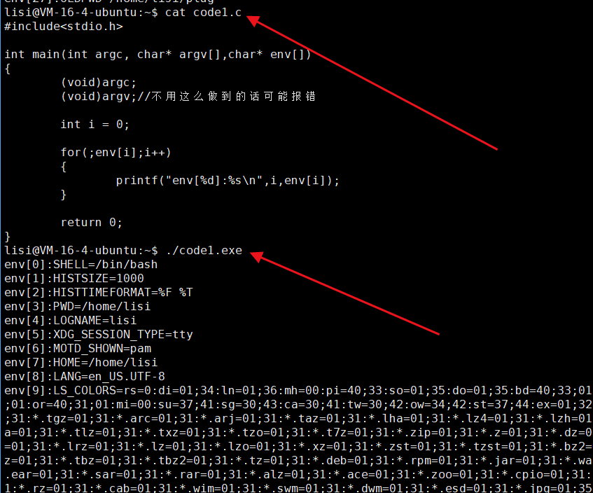 {(void)argc;(void)argv;//不用这么做到的话可能报错int i = 0;for(;env[i];i++){printf("env[%d]:&s\n",i,env[i]);}return 0;