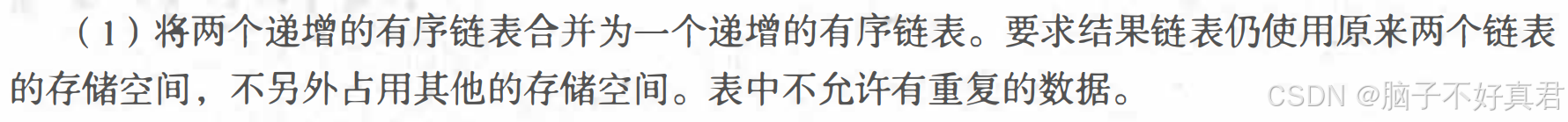 void MergeList_L(LinkList &La, LinkList &Lb, LinkList &Lc) {// 初始化指针pa = La->next; // pa 指向 La 的第一个数据结点pb = Lb->next; // pb 指向 Lb 的第一个数据结点// 使用 La 的头结点作为 Lc 的头结点Lc = pc = La;// 遍历两个链表,直到其中一个遍历完while (pa && pb) {// 如果 pa 的数据较小,将 pc 移动到新的尾结点,pa 后移指向下一个结点if (pa->data < pb->data) {pc->next = pa;pc = pa; // pc 移动到新的尾结点pa = pa->next; // pa 后移} // 如果 pb 的数据较小,将 pb 结点链接到 pc 后面(新的尾结点),pb 后移指向下一个结点else if (pa->data > pb->data) {pc->next = pb;pc = pb; // pc 移动到新的尾结点pb = pb->next; // pb 后移}// 如果数据相等,取 La 的元素,删除 Lb 的元素else {pc->next = pa;pc = pa; // pc 移动到新的尾结点pa = pa->next; // pa 后移q = pb->next; // 保存 pb 的下一个结点delete pb; // 释放当前 pb 结点pb = q; // pb 移动到下一个结点}}// 将剩余部分链接到结果链表尾部if (pa != NULL) {pc->next = pa; // 如果 pa 不为空,链接 pa 剩余部分} else {pc->next = pb; // 否则链接 pb 剩余部分}// 释放 Lb 的头结点delete Lb; }