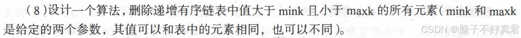 void delete(LinkList &L, int mink, int maxk) {if (L == NULL || L->next == NULL) return; // 空链表直接返回LNode *pre = L; // pre始终指向当前结点的前驱LNode *p = L->next; // p从首元结点开始遍历while (p != NULL) {if (p->data > mink && p->data < maxk) {// 找到需要删除的结点pre->next = p->next; // 跳过当前结点LNode *temp = p; // 临时保存要删除的结点p = p->next; // p指针后移free(temp); // 释放内存} else {// 不需要删除的结点pre = p;p = p->next;}} }