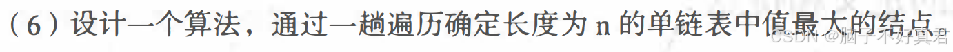 // 函数功能:在单链表中查找最大值 // 参数说明:L是带头结点的单链表 // 返回值:链表中最大的元素值,若链表为空则返回NULL int Max(LinkList L) {// 检查链表是否为空(只有头结点)if (L->next == NULL) {return NULL;}// 初始化指针LNode *pmax = L->next; // 假设第一个结点为最大值LNode *p = L->next->next; // 从第二个结点开始遍历// 遍历链表查找最大值while (p != NULL) {// 如果当前结点值大于已知最大值if (p->data > pmax->data) {pmax = p; // 更新最大值指针}p = p->next; // 移动到下一个结点}// 返回最大值结点的数据return pmax->data; }