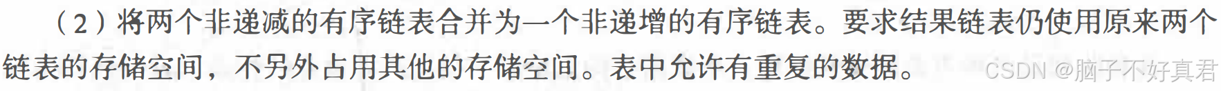 // 函数功能:合并两个有序链表La和Lb,结果存储在Lc中(使用头插法,结果为降序) // 参数说明: // La, Lb: 待合并的两个有序链表(带头结点) // Lc: 合并后的结果链表 void union(LinkList& La, LinkList& Lb, LinkList& Lc) {// 初始化指针pa = La->next; // pa指向La的第一个数据结点pb = Lb->next; // pb指向Lb的第一个数据结点// 使用La的头结点作为Lc的头结点Lc = pc = La;Lc->next = NULL; // 初始化Lc为空链表// 循环处理,直到两个链表都遍历完while (pa || pb) {// 选择较小的结点(或剩余结点)if (!pa) { // 如果La已遍历完//if (!pa)等价于 if (pa == NULL)q = pb; // 取Lb的当前结点pb = pb->next; // pb指针后移}else if (!pb) { // 如果Lb已遍历完q = pa; // 取La的当前结点pa = pa->next; // pa指针后移}// 比较两个链表的当前结点else if (pa->data <= pb->data) { // La的结点值较小或相等q = pa; // 取La的当前结点pa = pa->next; // pa指针后移}else { // Lb的结点值较小q = pb; // 取Lb的当前结点pb = pb->next; // pb指针后移}// 将选中的结点插入到Lc的头部(头插法)q->next = Lc->next; // 新结点的next指向原Lc的第一个结点Lc->next = q; // Lc的头结点指向新结点}// 释放Lb的头结点delete Lb; }