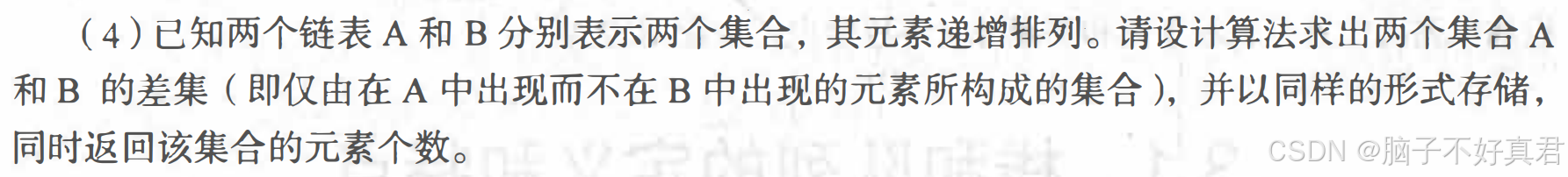 // 函数功能:求两个递增有序单链表的差集 A - B,结果存储在链表 A 中 // 参数说明: // A, B: 两个带头结点的递增有序单链表,分别存储一个集合 // n: 结果集合元素个数的引用,调用时传入一个整型变量 void Difference(LinkedList A, LinkedList B, int &n) {// 初始化工作指针p = A->next; // p 指向链表 A 的第一个数据结点q = B->next; // q 指向链表 B 的第一个数据结点 head = A; // head 指向 p 的前驱结点(即 A 的头结点)n = 0; // 初始化计数器(引用可以直接赋值)// 同步遍历两个链表,直到其中一个遍历完while (p != NULL && q != NULL) {if (p->data < q->data) {// 情况1:A 的当前结点值小于 B 的当前结点值// 该结点属于差集,保留并继续处理head = p; // head 指针后移,保持指向 p 的前驱p = p->next; // p 指针后移n++; // 差集元素个数加1(直接使用 n,不需要解引用)}else if (p->data > q->data) {// 情况2:A 的当前结点值大于 B 的当前结点值// B 需要继续向后查找可能相等的结点q = q->next; // q 指针后移}else {// 情况3:A 和 B 的当前结点值相等// 该结点不属于差集,需要从 A 中删除head->next = p->next; // 将前驱结点的 next 指向 p 的后继结点// 删除当前结点 pu = p; // 保存要删除的结点p = p->next; // p 指针后移delete u; // 释放被删除结点的内存}}// 循环结束后,如果 A 还有剩余结点,它们都属于差集while (p != NULL) {n++; // 差集元素个数加1p = p->next; // 继续遍历 A 的剩余结点} }