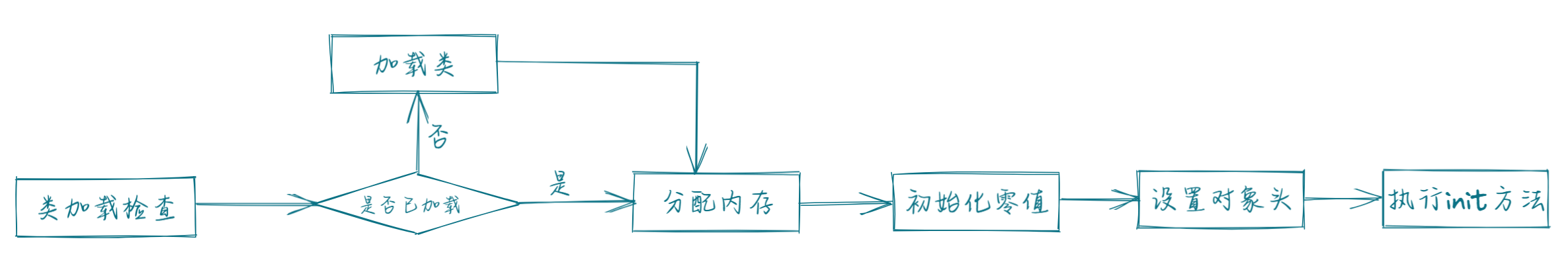 虚拟机遇到一条 new 指令时,首先将去检查这个指令的参数是否能在常量池中定位到一个类的符号引用,并且检查这个符号引用代表的类是否已被加载、解析和初始化过。如果没有,那必须先执行相应的类加载过程。new 指令对应到语言层面上讲是,new 关键词、对象克隆、对象序列化等。