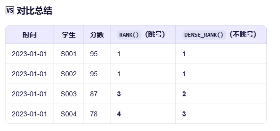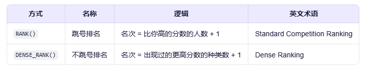 RANK按条数排,名次可能跳跃;DENSE_RANK按分数档排,名次连续递增。本质是“计条数”还是“计档”之别。