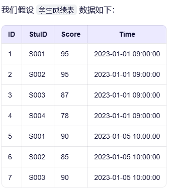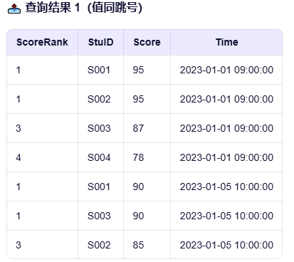 1.值同跳号:ScoreRank StuID Score (分组依据:时间,排名依据:分数)