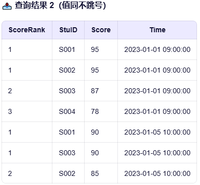 2.值同不跳号:ScoreRank StuID Score (分组依据:时间,排名依据:分数)