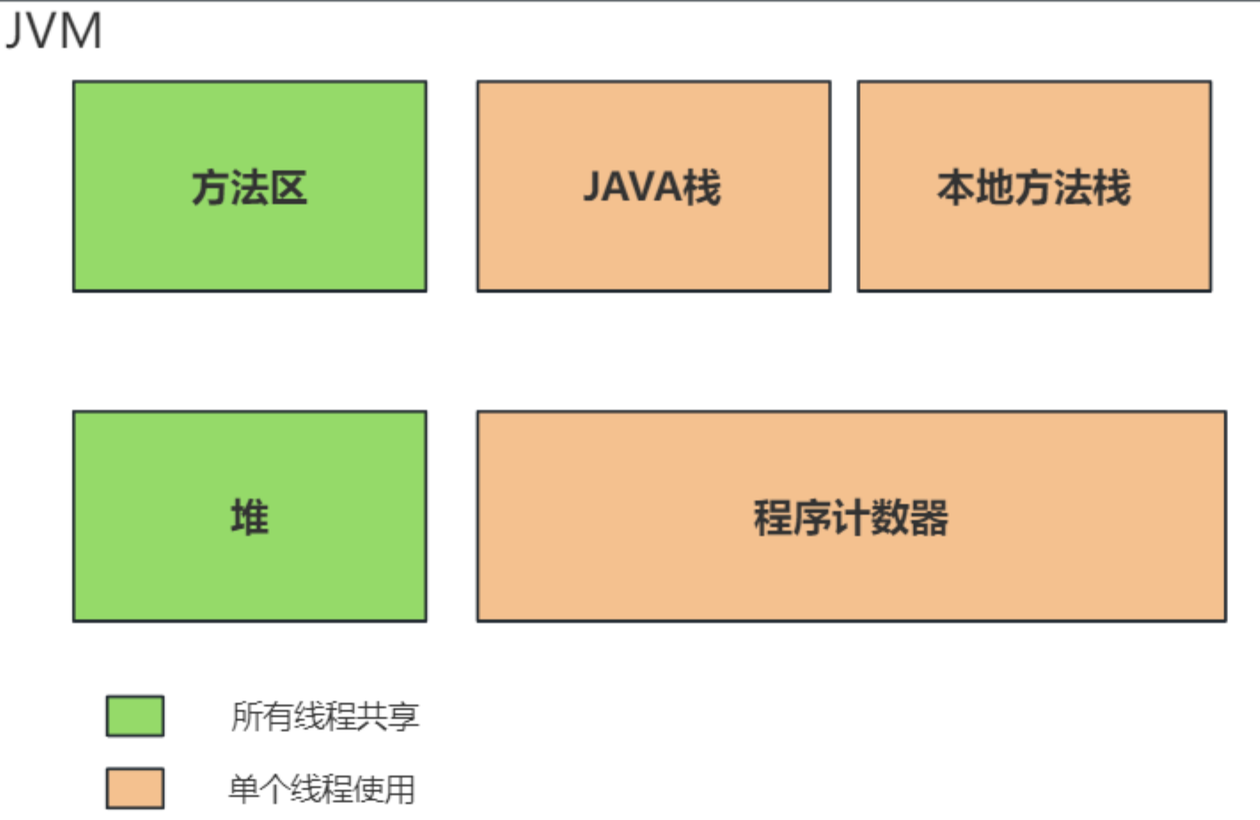 - **堆**(Heap):堆是JVM中最大的一块内存区域,用于存储对象实例和数组。堆内存溢出通常会出现`OutOfMemoryError`。如果JVM无法为新创建的对象分配足够的内存,就会抛出该异常。堆是所有线程共享的。