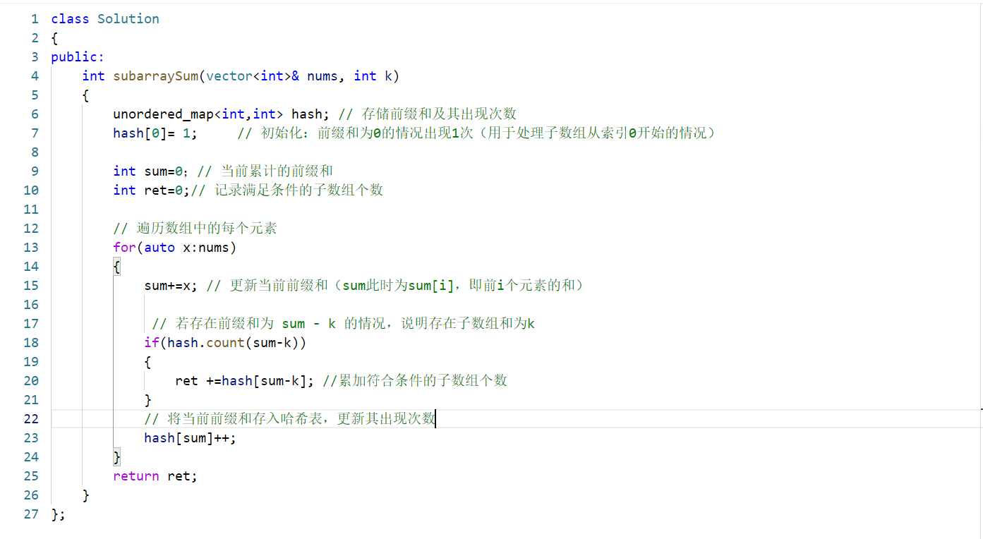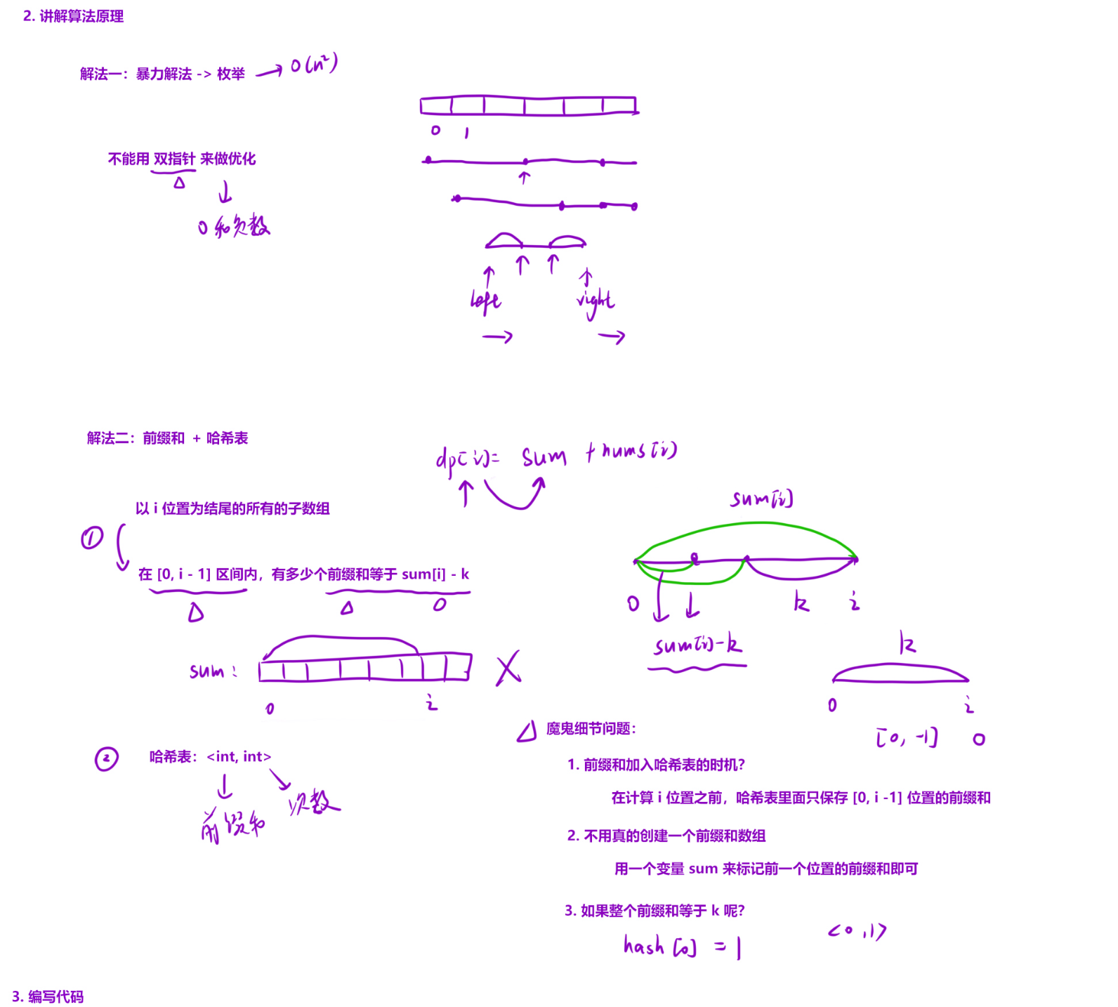 利用前缀和与哈希表的结合,将时间复杂度从暴力解法的 O (n²) 优化至 O (n)。