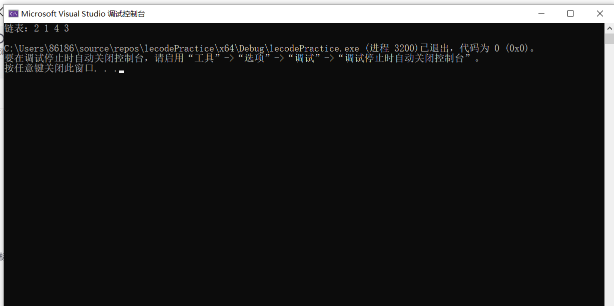 void testLeeCode24(void) { // LeeCode 24. 两两交换链表中的节点struct ListNode {int val;ListNode* next;ListNode() : val(0), next(nullptr) {}ListNode(int x) : val(x), next(nullptr) {}ListNode(int x, ListNode* next) : val(x), next(next) {}};class Solution {public:ListNode* swapPairs(ListNode* head) { // LeeCode 24. 两两交换链表中的节点// 方案: 将前俩个节点调换位置。 后面的部分也这么调用,递归实现。if (!head) return nullptr;ListNode *next = head->next;if (!next) return head;ListNode *last = next->next;next->next = head;last = swapPairs(last); // 递归后面部分head->next = last;return next;}};ListNode node1 = ListNode(1);ListNode node2 = ListNode(2);ListNode node3 = ListNode(3);ListNode node4 = ListNode(4);node1.next = &node2;node2.next = &node3;node3.next = &node4;Solution solution;ListNode* res = solution.swapPairs(&node1);// 打印链表std::cout << "链表:";for (ListNode *p = res; p; p = p->next) {std::cout << p->val << " ";}std::cout << endl;