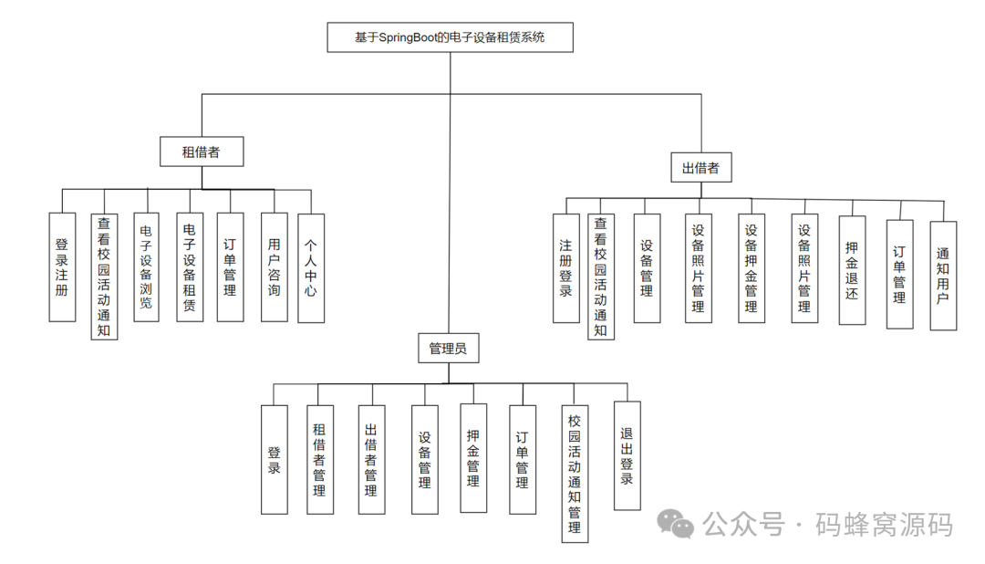 校园电子设备租赁系统包括管理员租赁者管理、出借者管理、设备管理、 押金管理、订单管理、校园电子设备通知管理、 退出登录等模块。整个系统的功能模块设计如图 :