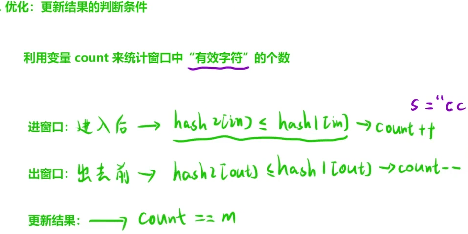 滑动窗口右移动的时候 要干掉左面的字符(干掉之前先和哈希表的字符比较一下 看这个字符是有效字符 是的话count会更新 )