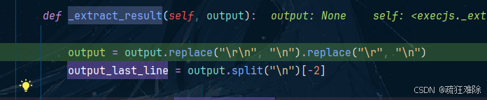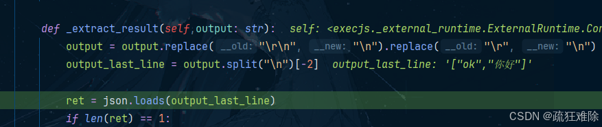 def _extract_result(self,output: str):output = output.replace("\r\n", "\n").replace("\r", "\n")output_split= output.split("\n")# 其他输出intermediate=output_split[:-3]# 返回值output_last_line = output_split[-2]ret = json.loads(output_last_line)if len(ret) == 1:ret = [ret[0], None]status, value = retif status == "ok":return {'return_value': value,'intermediate_value': intermediate}else:raise ProgramError(value)