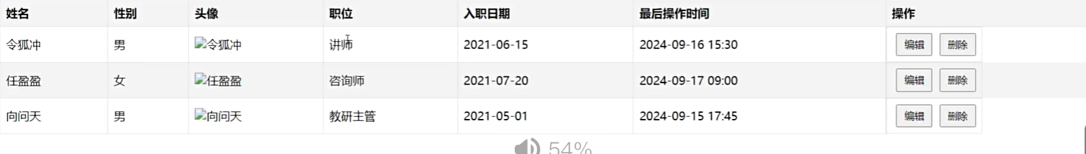</head><body>(表格标签)<!-- 一表格展示区 --><table><thead>(表头标签)<tr>(被tr包裹的都在一行)<th>姓名</th>(th定义表头单元格)<th>性别</th><th>头像</th><th>职位</th><th>入职日期</th><th>最后操作时间</th><th>操作</th></tr></thead><tbody>(表数据,表体标签)<tr><td>令狐</td>(定义单元格)<td>男</td><td><img class="avatar"(类选择器) src="path/to/avatar.jpg" alt=""></td><td>讲师</td><td>2021-06-15</td><td>2024-09-16 15:30</td><td class="action-buttons"><button type="button">编辑</button><button type="button">删除</button></td></tr><tr><td>任盈盈</td><td>女</td><td><img class="avatar"(类选择器) src="path/to/avatar.jpg" alt="任盈盈"></td><td>咨询师</td><td>2021-07-20</td><td>2024-09-17 09:00</td><td class="action-buttons"(类选择器)><button(按钮标签) type="button"(普通按钮)>编辑</button(按钮标签)><button(按钮标签) type="button"(普通按钮)>别除</button(按钮标签)></td></tr><tr><td>向问天</td><td>男</td><td><img class="avatar" src="path/to/avatar.jpg" alt="向问天"></td><td>教研主管</td><td>2022-01-10</td><td>2024-09-18 10:00</td><td class="action-buttons"><button type="button">编辑</button><button type="button">删除</button></td></tr></tbody></table></body></html>