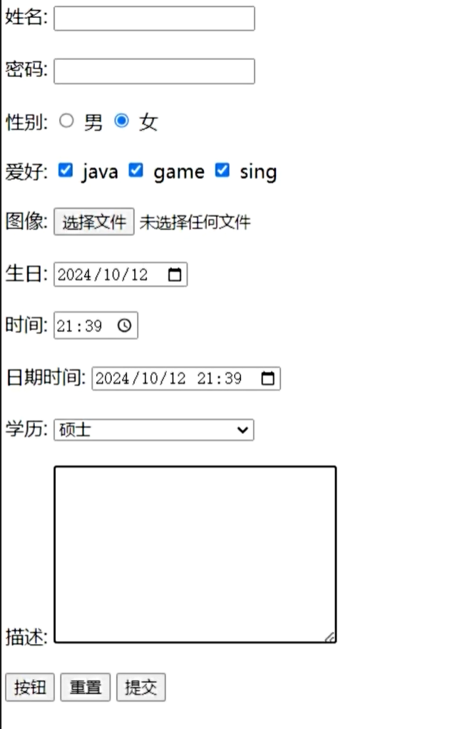 <form action="路径" method="提交方式">姓名:<input type="text(文本框)" name="name"><br><br>密码:<input type="password(密码框)" name="password"><br><br>性别:<input type="radio(单选框)" name="gender" (同一组name属性一样) value="1" (选择男提交1)>男<label><input type="radio" name="gender" (同一组name属性一样) value="2" (选择女提交2)>女</label><br><br>爱好:<label><input type="checkbox" (复选框可以选择多个) name="hobby" value="java">(选择java提交java)java </label><label><input type="checkbox" (复选框可以选择多个) name="hobby" value="game">(选择game提交game)game </label><label><input type="checkbox" (复选框可以选择多个) name="hobby" value="sing">(选择sing提交sing)sing </label><br><br>图像:<input type="file" (文件上传框)name="image"><br><br>生日:<input type="date" (日期选择框) name="birthday'"><br><br>时间:<input type="time" (时间选择框) name="time"><br><br>日期时间:<input type="datetime-local" (日期时间选择框) name="datetime"><br><br>学历:<select name="degree" (下拉列表名字)>(select下拉列表)<option value="">---------------请选择----------</option>(下拉列表选项)<option value="1" (表单项提交的值)>大专</option><option value="2" (表单项提交的值)>本科</option><option value="3" (表单项提交的值)>硕士</option><option value="4" (表单项提交的值)>博士</option></select><br><br>描述:<textarea name="description" cols="30" rows="10"></textarea> <br><br><!-- textarea 大文本框 这个文本框的 cols="列数" rows="行数" --><!-- 隐藏表单不会显示出来 --><input type="hidden" name="id" value="1"><!-- <!-一表单常见按钮-一> --><input type="button"(普通按钮) value="按钮"(按钮名字)><input type="reset"(重置按钮) value="重置"(按钮名字)><input type="submit" (提交按钮)value="提交"(按钮名字)><!-- 还有查询按钮,清空按钮 --><br></form><!-- label的作用:包裹的表单项,点击文字也可以选择表单项 --><!-- br换行标签 -->
