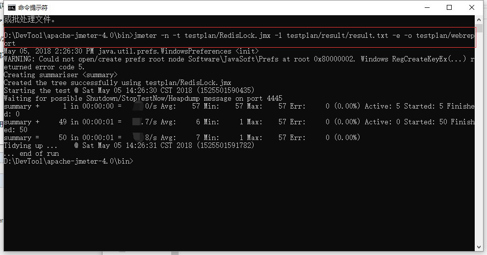 jmeter -n -t testplan/RedisLock.jmx -l testplan/result/result.txt -e -o testplan/webreport