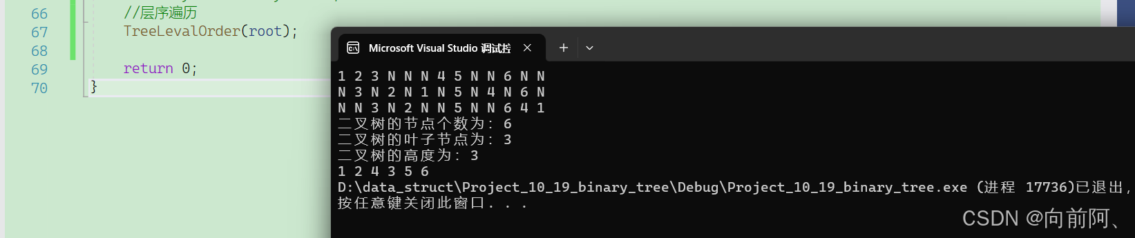 {if (root == NULL){return;}//此时root肯定不是空,则将根节点插入队列中Que q;QueueInit(&q);QueuePush(&q, root);while (!QueueEmpty(&q)){BTNode* front = QueueFront(&q);QueuePop(&q);printf("%d ", front->data);if (front->left){QueuePush(&q, front->left);}if (front->right){QueuePush(&q, front->right);}}