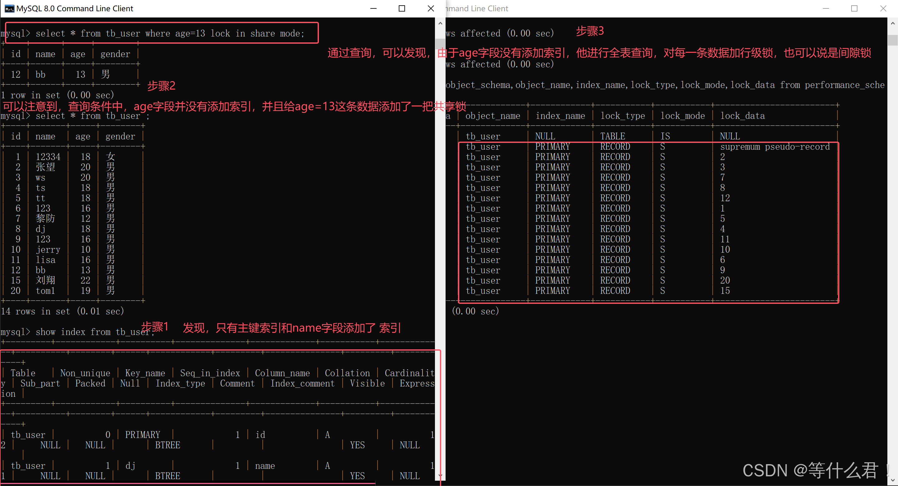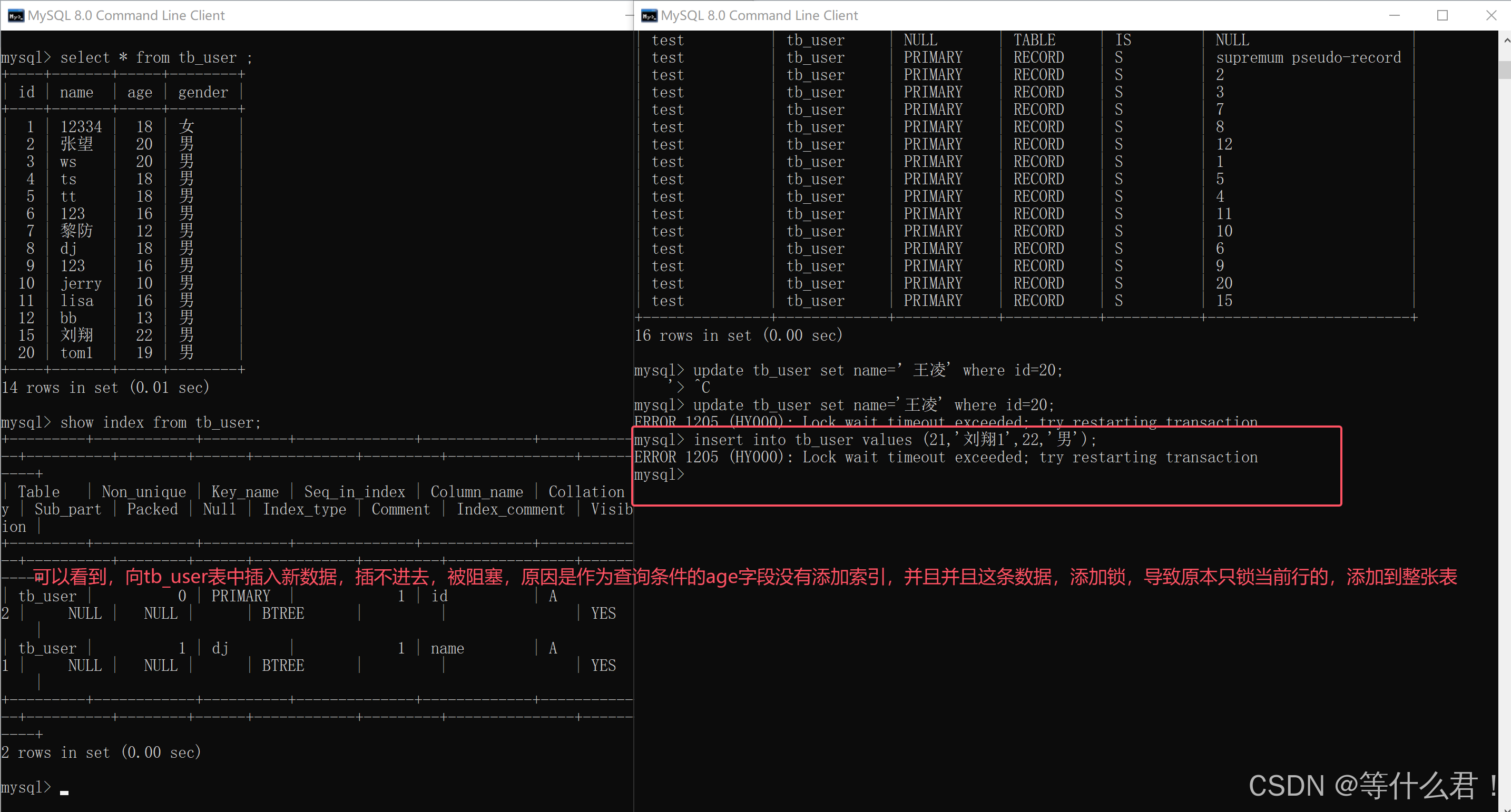 翻译就是:如果查询条件是没有添加索引的字段,那么锁的范围将从原本的行级锁转变为表级锁/全表的间隙锁