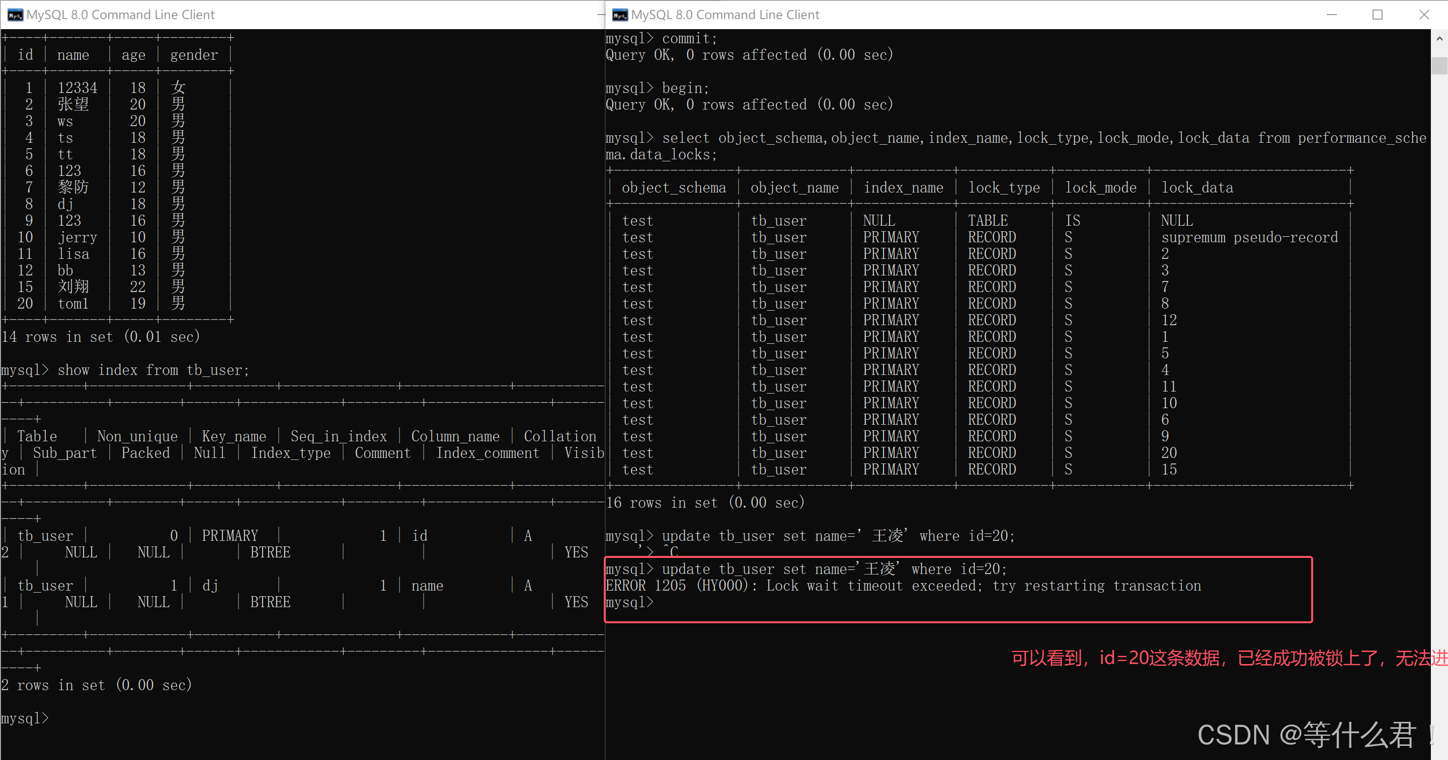 测试:如果,我修改id=20,将name 值 修改为王凌,观察右侧,是否会发生阻塞