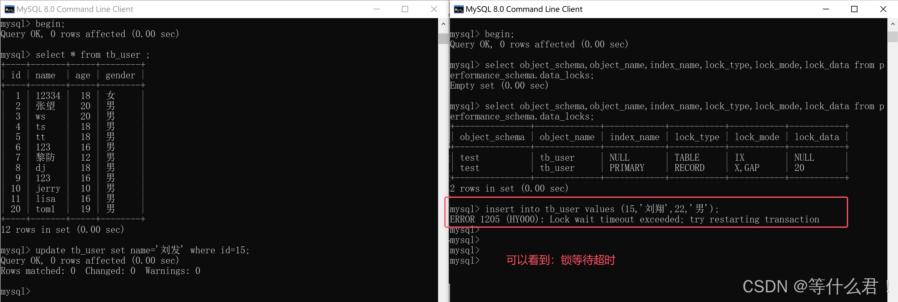 最终超时,抛出:ERROR 1205 (HY000): Lock wait timeout exceeded