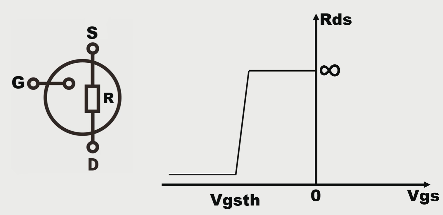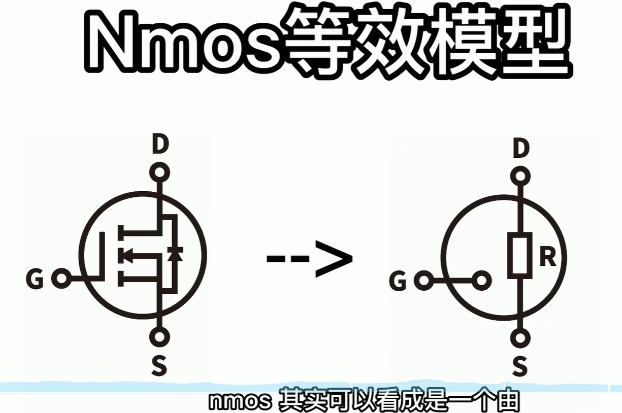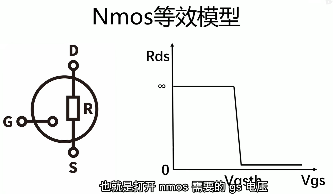 横坐标是gs的电压差,纵坐标是电阻的值,当gs的电压小于一个特定值的时候,电阻基本上是无穷大的;当这个电压值大于这个特定值的时候,电阻就接近于零;这个临界电压值我们称为:Vgsth也就是打开NMOS需要的gs电压;Vgsth应该小于高电平的电压值,否则NMOS就没有办法打开。