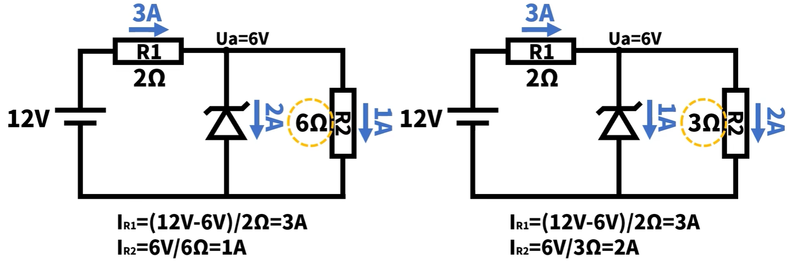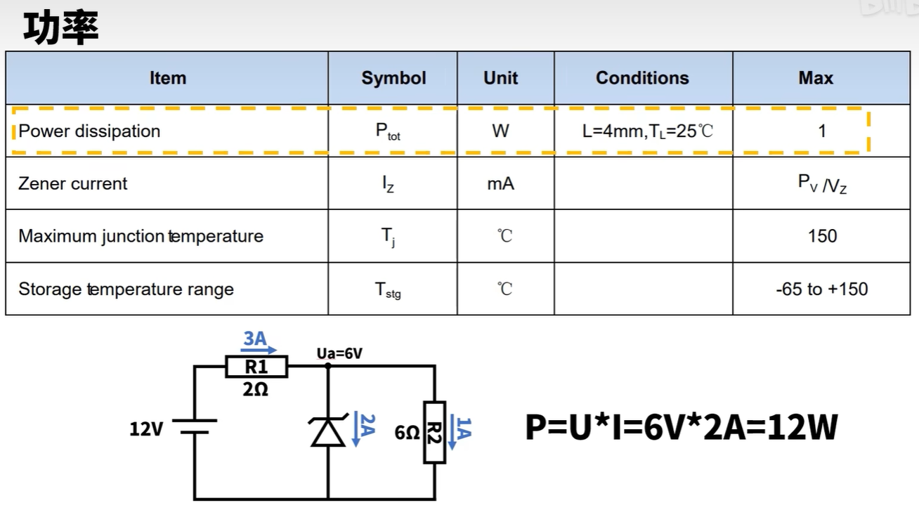 当你把R2看成负载的时候,就可以认为这个齐纳二极管把12V的电源,稳定在了6V这就是齐纳二极管的工作原理。注意:第一R1这颗电阻式是一定要存在的,这样子直接接入会导致齐纳二极管上的电流过大而烧毁。