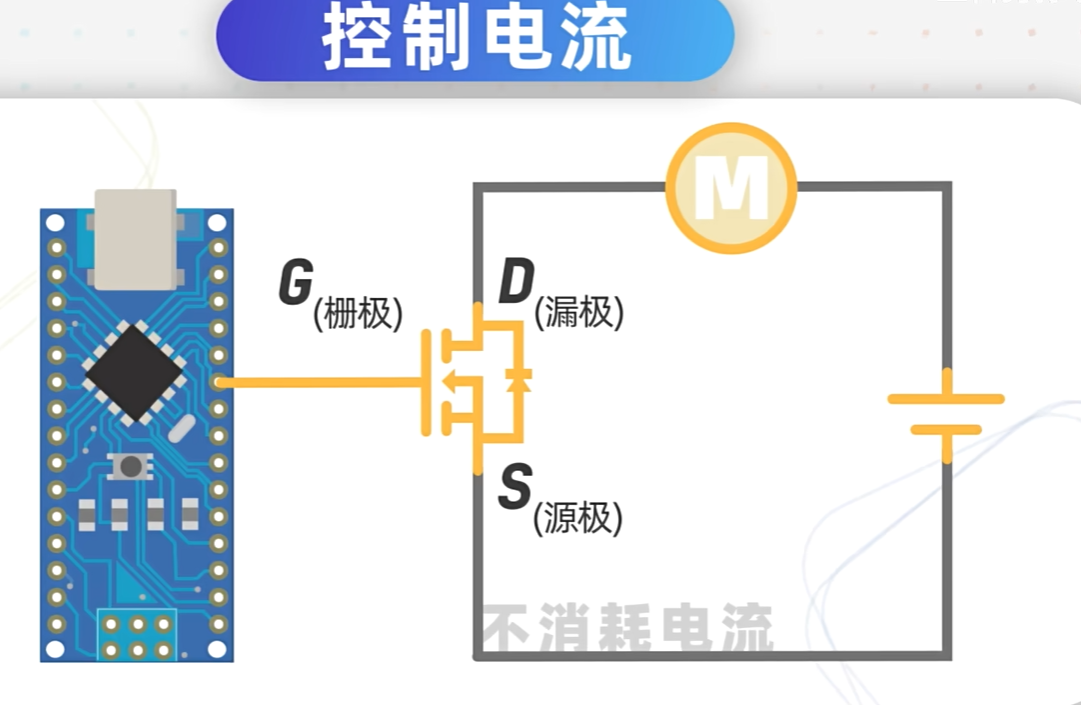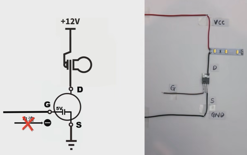 对于MOS管来说,g和s之间不存在通路的,他们之间仅仅存在一个寄生电容,当给gate施加高电平的时候,除了一开始给这个寄生电容充电的电流外,并不存在其他的电流,只要维持gs电压差,MOS管就可以打开,因为这个寄生电容的存在,即便我撤走了IO口的高电平,你会发现灯泡依然是亮着的,直到这个电容上的电荷慢慢放光mos管才会关闭,这就是MOS管被称为电压控制器的原因了。