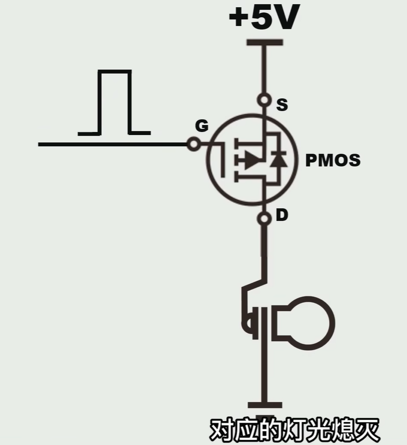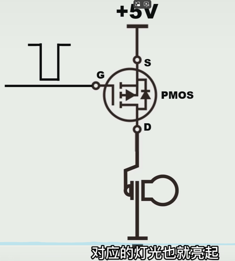当gate给高电平的时候PMOS就关闭,对应的灯光就熄灭 ,低电平PMOS就打开对应的灯光就打开