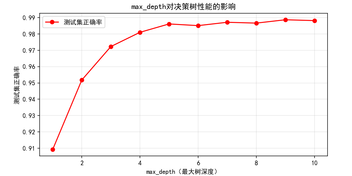 print(f"\n最优max_depth:{best_depth},对应测试集正确率:{best_score:.4f}")# 5.2 调试criterion(不纯度计算方式):对比gini与entropy