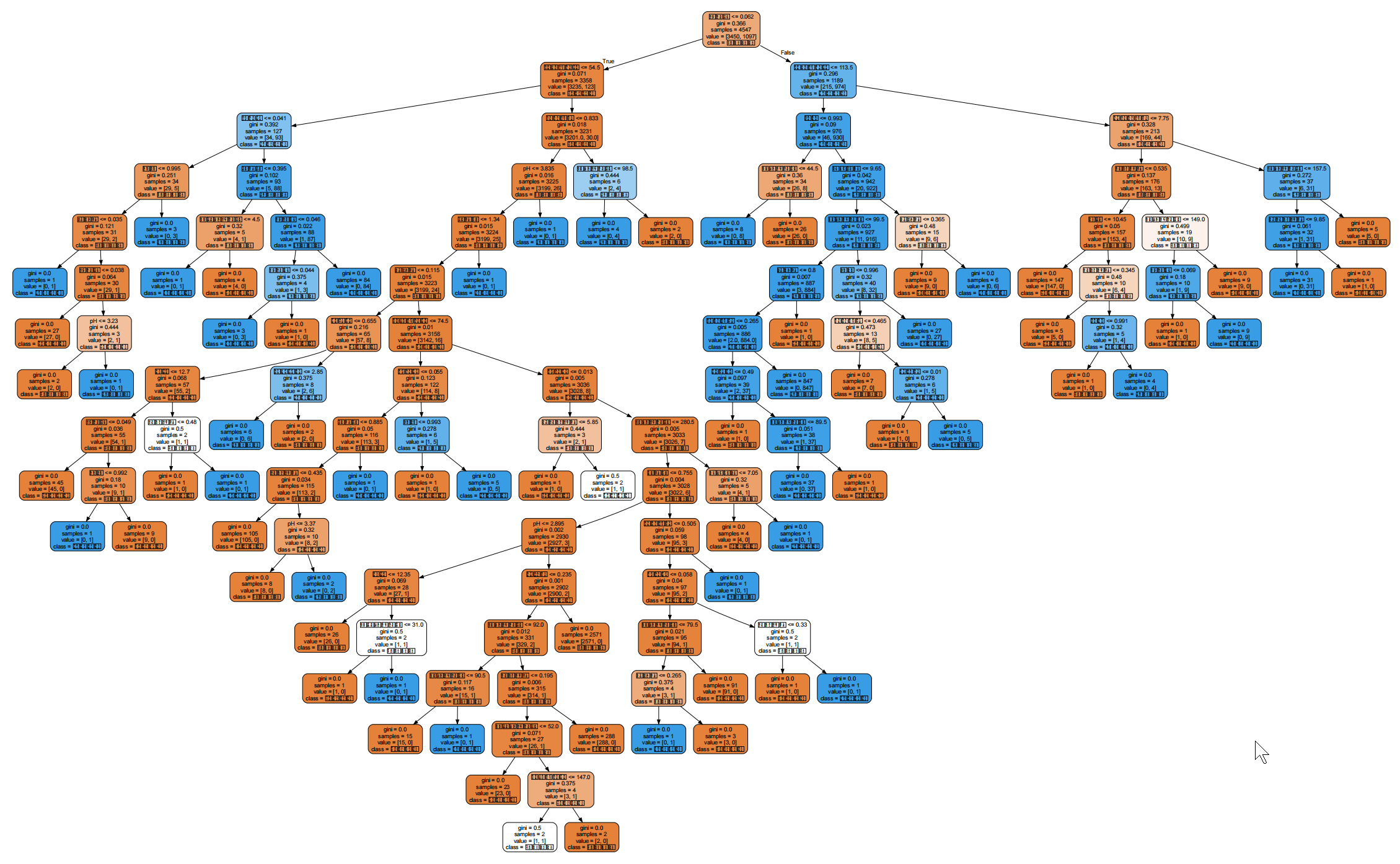 dot_data = tree.export_graphviz(dt_base, # 训练好的决策树模型feature_names=feature_name_cn, # 特征中文名称class_names=['白葡萄酒', '红葡萄酒'], # 标签中文名称(0=白,1=红)filled=True, # 节点填充颜色(按类别区分)rounded=True # 节点边框圆角