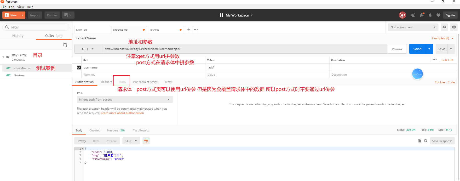 * 后端服务接口* 校验用户名是否重复接口* 接口文档* 请求地址 /day13/checkName* 请求方式 get/post* 请求参数 username string* 返回数据格式 json* 返回数据示例* 重复* {code: 10011,msg: "用户名重复",returnData: "red"}* 可用{code: 10010,msg: "用户名可用",returnData: "green"}