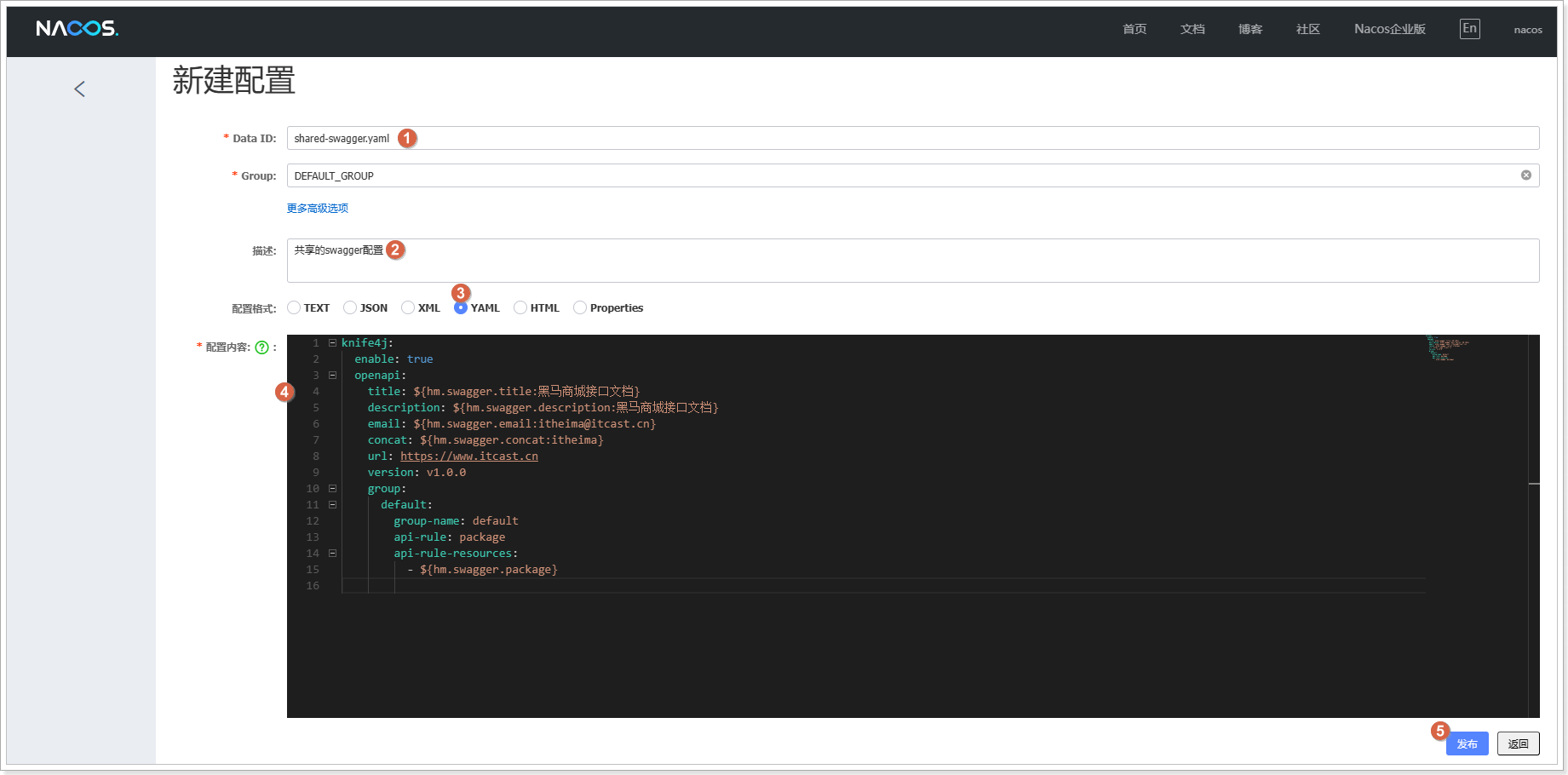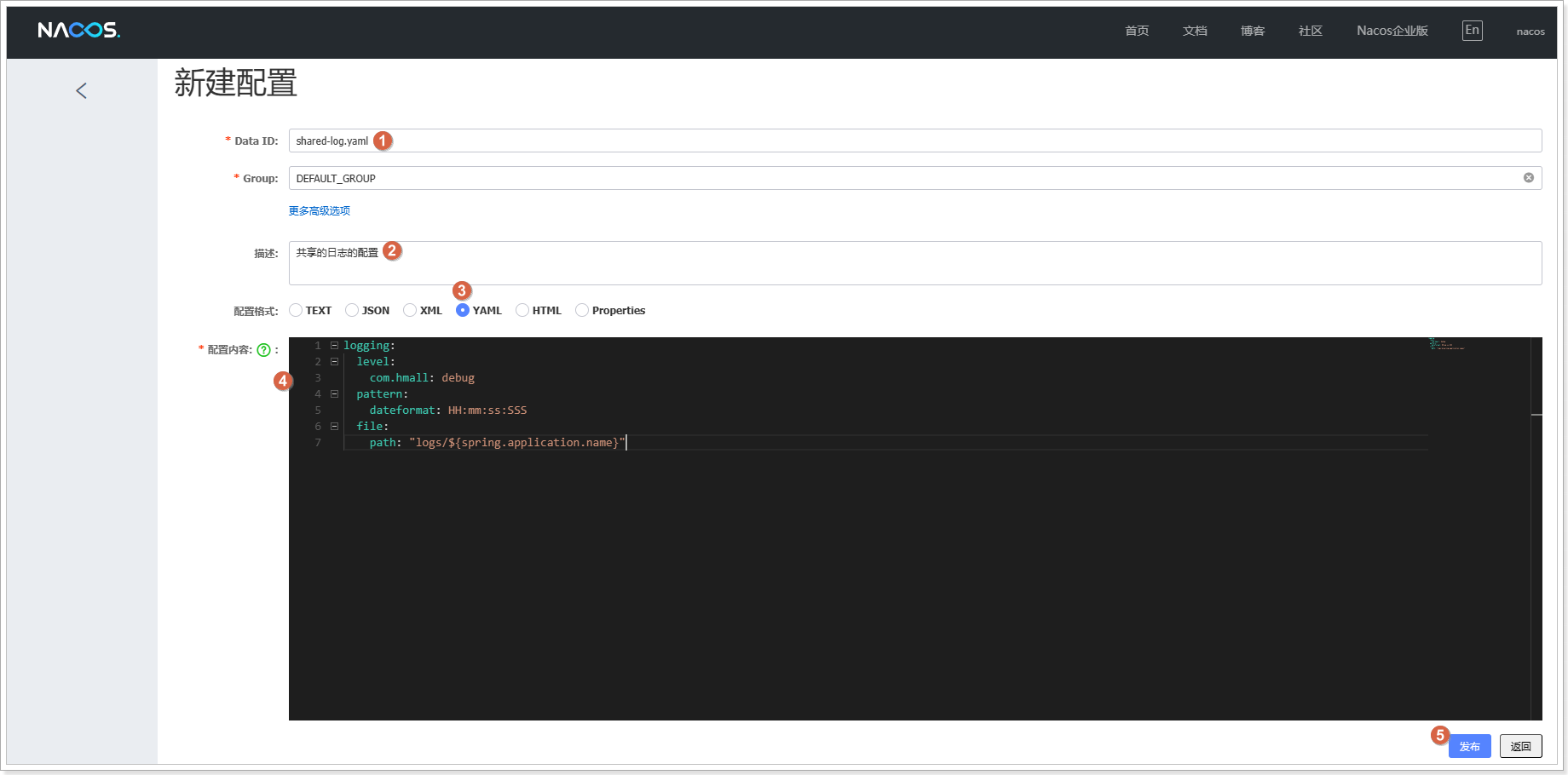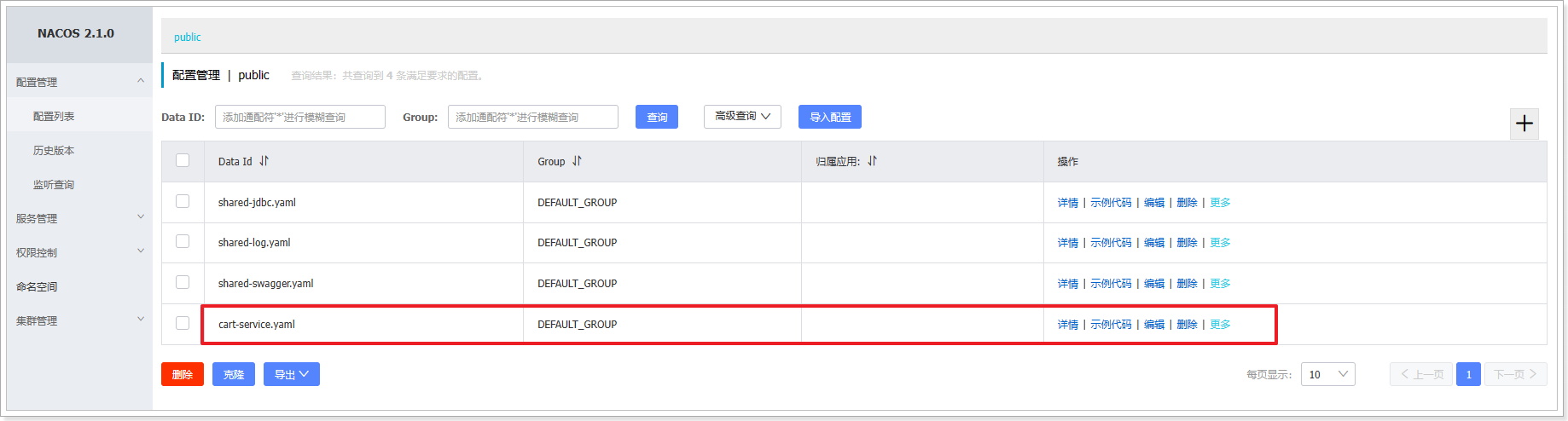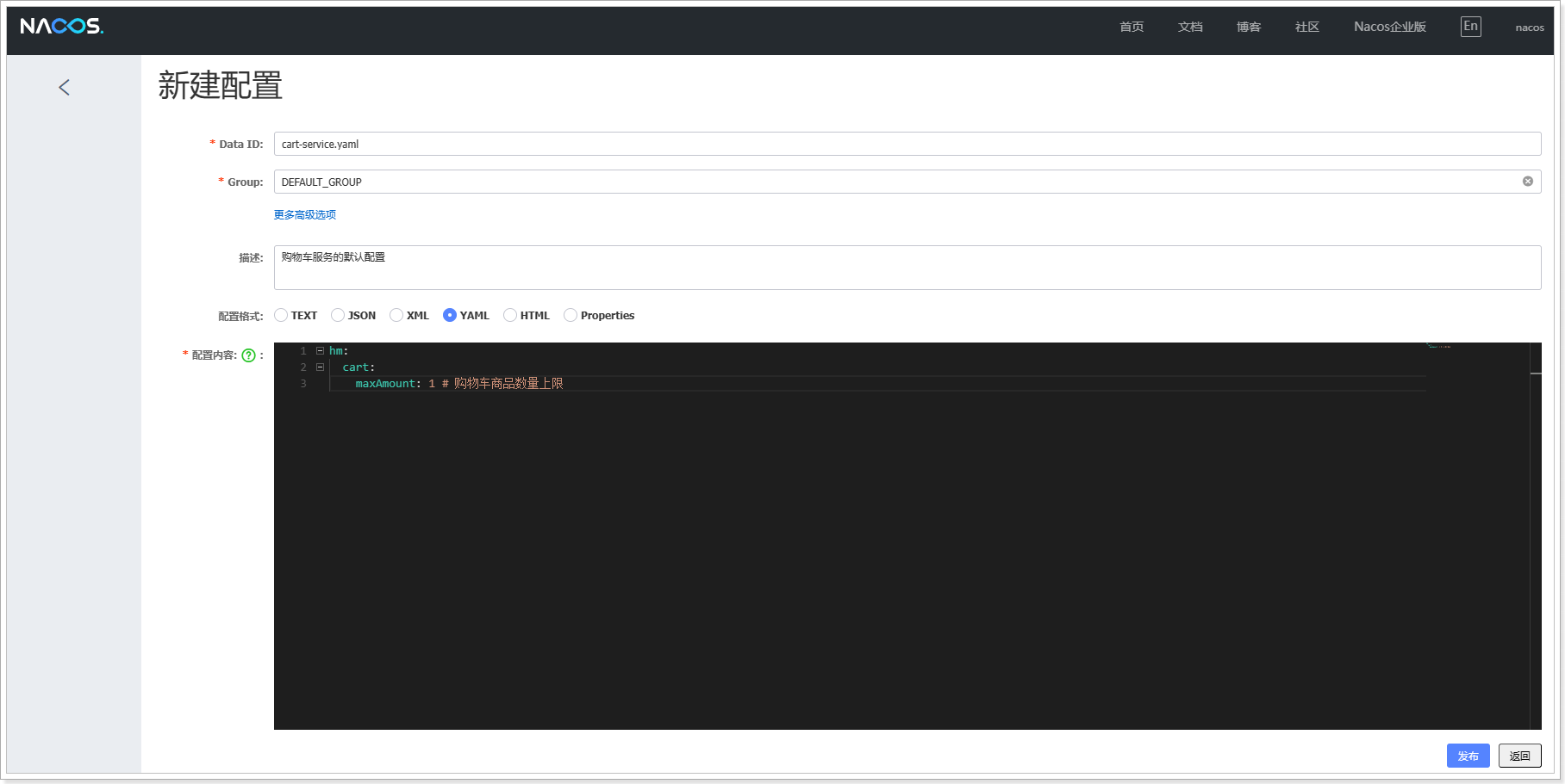 发布配置之后,在Nacos控制台查看到新添加的配置: