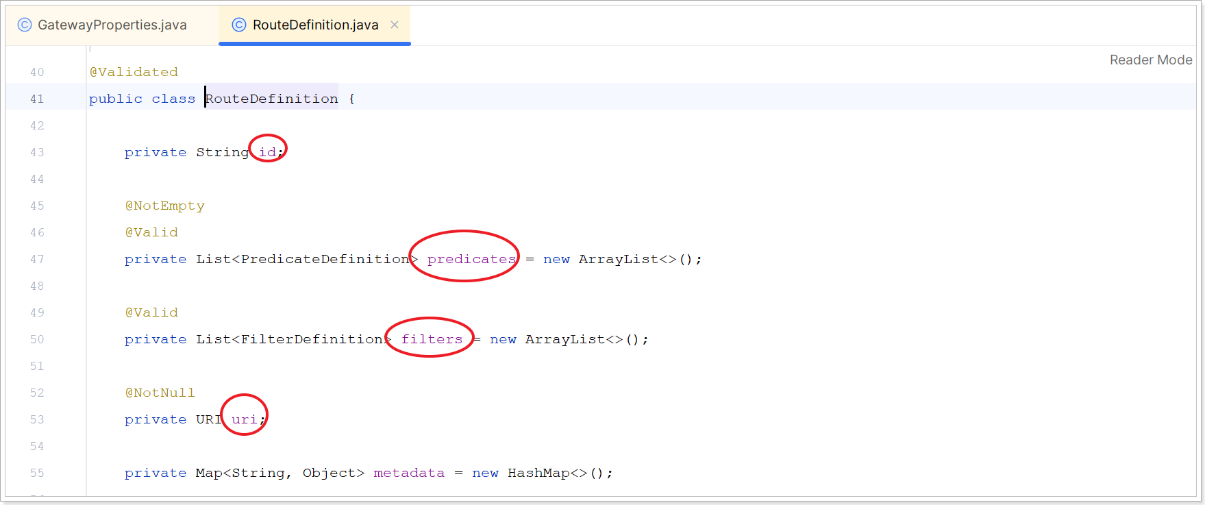 这里更新的路由,也就是RouteDefinition,之前我们见过,包含下列常见字段: