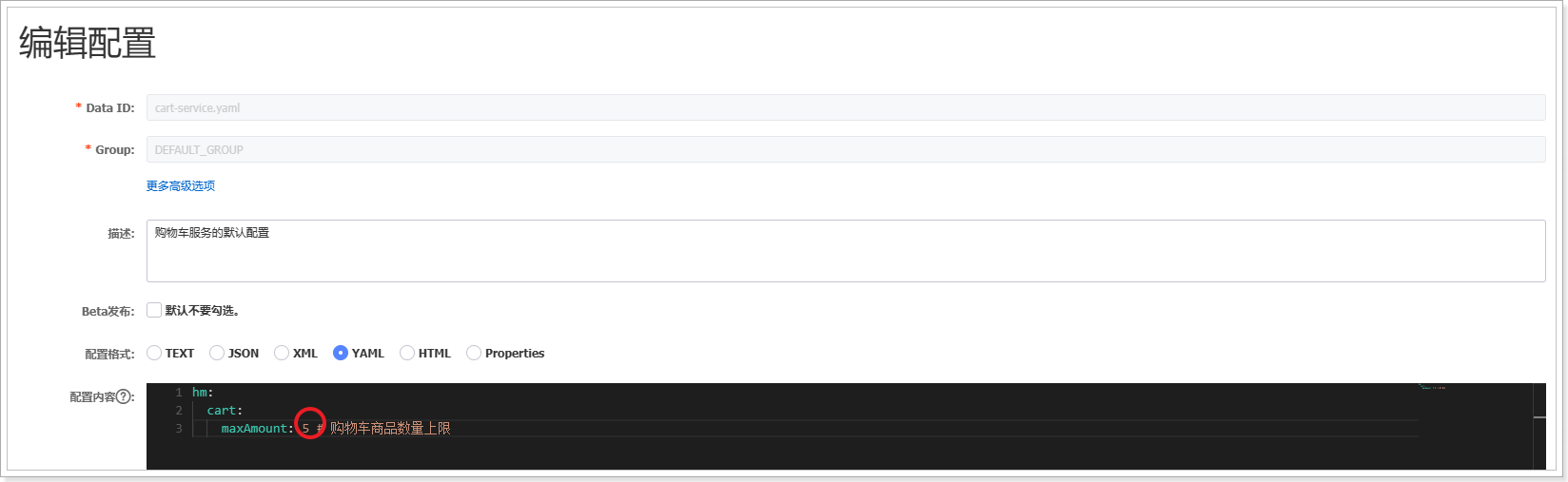我们在nacos控制台,将购物车上限设置为 5:
