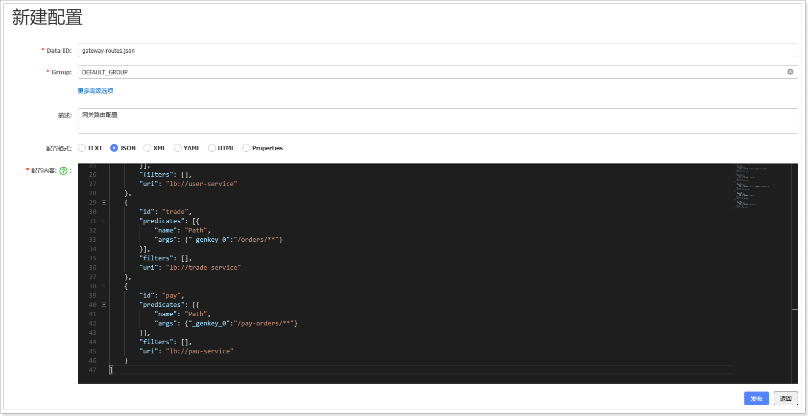 接下来,我们直接在Nacos控制台添加路由,路由文件名为gateway-routes.json