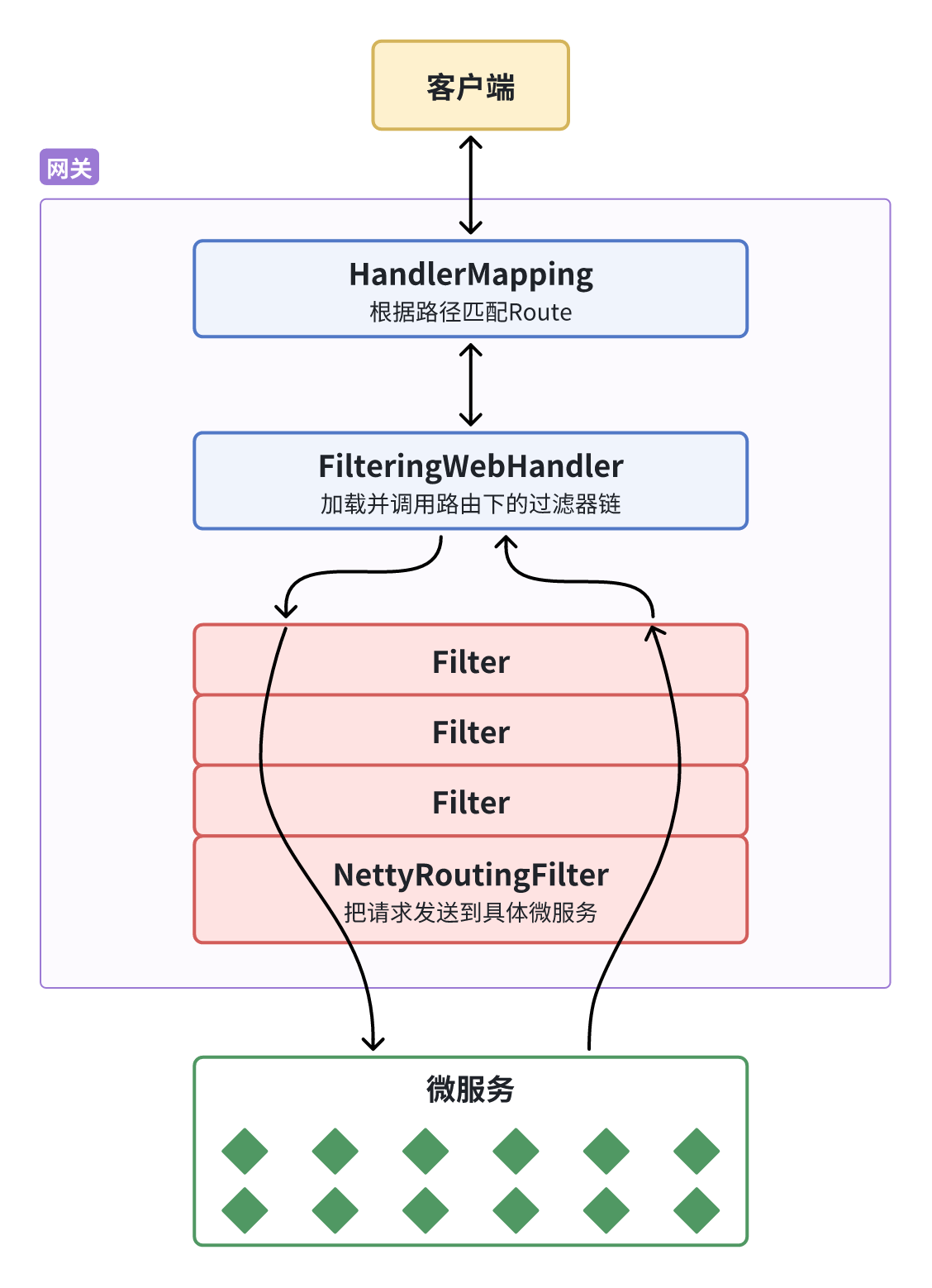 现在,微服务网关就起到同样的作用。前端请求不能直接访问微服务,而是要请求网关:
