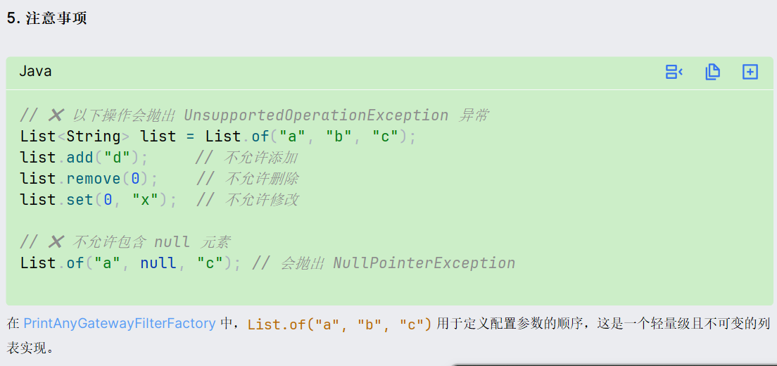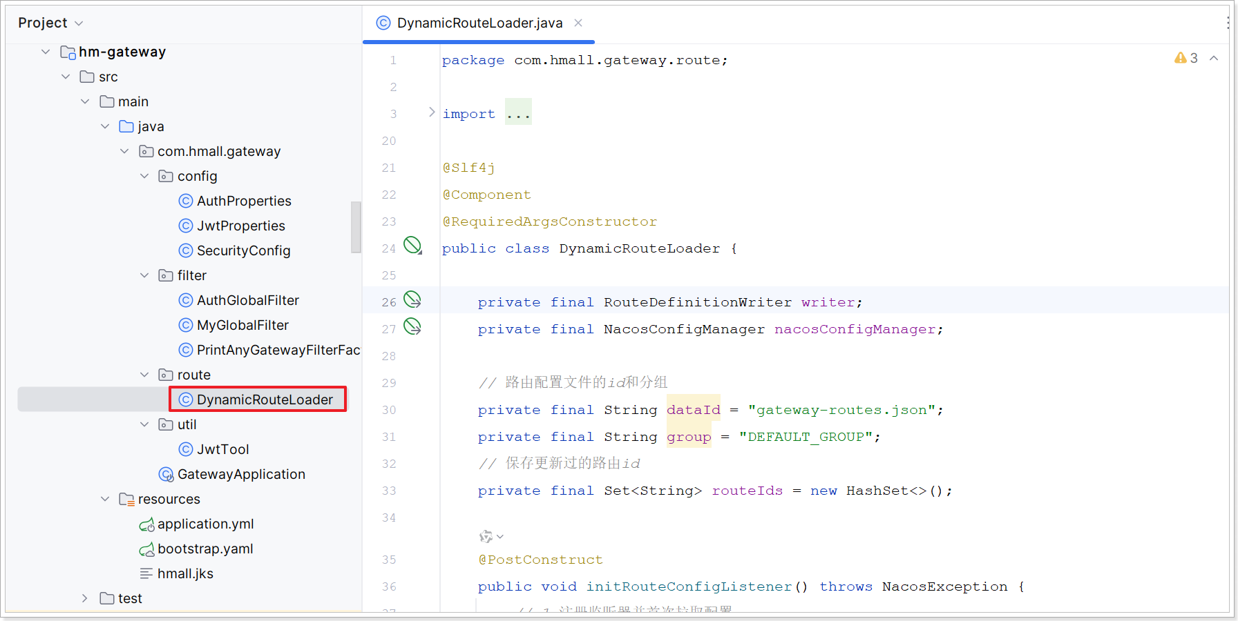 public class DynamicRouteLoader {private final RouteDefinitionWriter writer;private final NacosConfigManager nacosConfigManager;// 路由配置文件的id和分组private final String dataId = "gateway-routes.json";private final String group = "DEFAULT_GROUP";// 保存更新过的路由idprivate final Set<String> routeIds = new HashSet<>();@PostConstructpublic void initRouteConfigListener() throws NacosException {// 1.注册监听器并首次拉取配置String configInfo = nacosConfigManager.getConfigService().getConfigAndSignListener(dataId, group, 5000, new Listener() {@Overridepublic Executor getExecutor() {return null;}@Overridepublic void receiveConfigInfo(String configInfo) {updateConfigInfo(configInfo);}});// 2.首次启动时,更新一次配置updateConfigInfo(configInfo);}private void updateConfigInfo(String configInfo) {log.debug("监听到路由配置变更,{}", configInfo);// 1.反序列化List<RouteDefinition> routeDefinitions = JSONUtil.toList(configInfo, RouteDefinition.class);// 2.更新前先清空旧路由// 2.1.清除旧路由for (String routeId : routeIds) {writer.delete(Mono.just(routeId)).subscribe();}routeIds.clear();// 2.2.判断是否有新的路由要更新if (CollUtils.isEmpty(routeDefinitions)) {// 无新路由配置,直接结束return;}// 3.更新路由routeDefinitions.forEach(routeDefinition -> {// 3.1.更新路由writer.save(Mono.just(routeDefinition)).subscribe();// 3.2.记录路由id,方便将来删除routeIds.add(routeDefinition.getId());});}