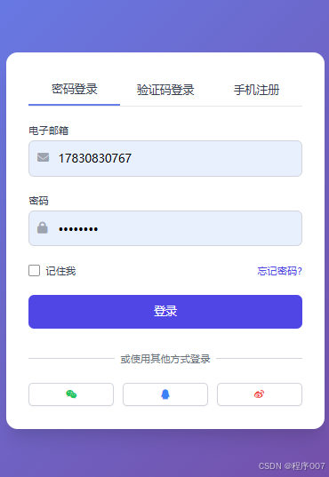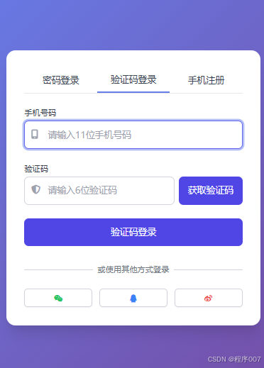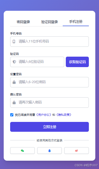 <body class="gradient-bg min-h-screen flex items-center justify-center p-4"><div class="bg-white rounded-2xl p-8 w-full max-w-md card-shadow"><!-- 选项卡导航 --><div class="flex border-b border-gray-200 mb-6"><button id="tabLogin" class="flex-1 py-2 px-4 text-center font-medium text-gray-700 tab-active">密码登录</button><button id="tabSmsLogin" class="flex-1 py-2 px-4 text-center font-medium text-gray-700">验证码登录</button><button id="tabRegister" class="flex-1 py-2 px-4 text-center font-medium text-gray-700">手机注册</button></div><!-- 密码登录表单 --><div id="loginFormContainer" class="space-y-6 slide-in"><div><label class="block text-sm font-medium text-gray-700 mb-1">电子邮箱</label><div class="relative"><div class="absolute inset-y-0 left-0 pl-3 flex items-center pointer-events-none"><i class="fas fa-envelope text-gray-400"></i></div><input type="email" id="loginEmail" requiredclass="pl-10 w-full px-4 py-3 rounded-lg border border-gray-300 focus:outline-none focus:border-indigo-500 input-focus"placeholder="请输入您的邮箱"></div></div><div><label class="block text-sm font-medium text-gray-700 mb-1">密码</label><div class="relative"><div class="absolute inset-y-0 left-0 pl-3 flex items-center pointer-events-none"><i class="fas fa-lock text-gray-400"></i></div><input type="password" id="loginPassword" requiredclass="pl-10 w-full px-4 py-3 rounded-lg border border-gray-300 focus:outline-none focus:border-indigo-500 input-focus"placeholder="请输入您的密码"></div></div><div class="flex items-center justify-between"><div class="flex items-center"><input id="rememberMe" type="checkbox" class="h-4 w-4 text-indigo-600 focus:ring-indigo-500 border-gray-300 rounded"><label for="rememberMe" class="ml-2 block text-sm text-gray-700">记住我</label></div><div class="text-sm"><a href="#" class="font-medium text-indigo-600 hover:text-indigo-500">忘记密码?</a></div></div><button id="loginBtn"class="w-full bg-indigo-600 text-white py-3 px-4 rounded-lg hover:bg-indigo-700 focus:outline-none focus:ring-2 focus:ring-offset-2 focus:ring-indigo-500 transition-all">登录</button></div><!-- 验证码登录表单 --><div id="smsLoginFormContainer" class="space-y-6 hidden"><div><label class="block text-sm font-medium text-gray-700 mb-1">手机号码</label><div class="relative"><div class="absolute inset-y-0 left-0 pl-3 flex items-center pointer-events-none"><i class="fas fa-mobile-alt text-gray-400"></i></div><input type="tel" id="smsPhone" requiredclass="pl-10 w-full px-4 py-3 rounded-lg border border-gray-300 focus:outline-none focus:border-indigo-500 input-focus"placeholder="请输入11位手机号码" pattern="[0-9]{11}"></div></div><div><label class="block text-sm font-medium text-gray-700 mb-1">验证码</label><div class="flex space-x-2"><div class="relative flex-grow"><div class="absolute inset-y-0 left-0 pl-3 flex items-center pointer-events-none"><i class="fas fa-shield-alt text-gray-400"></i></div><input type="text" id="smsCode" requiredclass="pl-10 w-full px-4 py-3 rounded-lg border border-gray-300 focus:outline-none focus:border-indigo-500 input-focus"placeholder="请输入6位验证码" pattern="[0-9]{6}"></div><button id="sendSmsCodeBtn"class="whitespace-nowrap px-4 py-3 bg-indigo-600 text-white rounded-lg hover:bg-indigo-700 focus:outline-none focus:ring-2 focus:ring-offset-2 focus:ring-indigo-500 transition-all">获取验证码</button></div></div><button id="smsLoginBtn"class="w-full bg-indigo-600 text-white py-3 px-4 rounded-lg hover:bg-indigo-700 focus:outline-none focus:ring-2 focus:ring-offset-2 focus:ring-indigo-500 transition-all">验证码登录</button></div><!-- 手机注册表单 --><div id="registerFormContainer" class="space-y-6 hidden"><div><label class="block text-sm font-medium text-gray-700 mb-1">手机号码</label><div class="relative"><div class="absolute inset-y-0 left-0 pl-3 flex items-center pointer-events-none"><i class="fas fa-mobile-alt text-gray-400"></i></div><input type="tel" id="registerPhone" requiredclass="pl-10 w-full px-4 py-3 rounded-lg border border-gray-300 focus:outline-none focus:border-indigo-500 input-focus"placeholder="请输入11位手机号码" pattern="[0-9]{11}"></div></div><div><label class="block text-sm font-medium text-gray-700 mb-1">验证码</label><div class="flex space-x-2"><div class="relative flex-grow"><div class="absolute inset-y-0 left-0 pl-3 flex items-center pointer-events-none"><i class="fas fa-shield-alt text-gray-400"></i></div><input type="text" id="registerCode" requiredclass="pl-10 w-full px-4 py-3 rounded-lg border border-gray-300 focus:outline-none focus:border-indigo-500 input-focus"placeholder="请输入6位验证码" pattern="[0-9]{6}"></div><button id="sendRegisterCodeBtn"class="whitespace-nowrap px-4 py-3 bg-indigo-600 text-white rounded-lg hover:bg-indigo-700 focus:outline-none focus:ring-2 focus:ring-offset-2 focus:ring-indigo-500 transition-all">获取验证码</button></div></div><div><label class="block text-sm font-medium text-gray-700 mb-1">设置密码</label><div class="relative"><div class="absolute inset-y-0 left-0 pl-3 flex items-center pointer-events-none"><i class="fas fa-lock text-gray-400"></i></div><input type="password" id="registerPassword" requiredclass="pl-10 w-full px-4 py-3 rounded-lg border border-gray-300 focus:outline-none focus:border-indigo-500 input-focus"placeholder="请输入6-20位密码" minlength="6" maxlength="20"></div></div><div><label class="block text-sm font-medium text-gray-700 mb-1">确认密码</label><div class="relative"><div class="absolute inset-y-0 left-0 pl-3 flex items-center pointer-events-none"><i class="fas fa-lock text-gray-400"></i></div><input type="password" id="confirmPassword" requiredclass="pl-10 w-full px-4 py-3 rounded-lg border border-gray-300 focus:outline-none focus:border-indigo-500 input-focus"placeholder="请再次输入密码" minlength="6" maxlength="20"></div></div><div class="flex items-center"><in