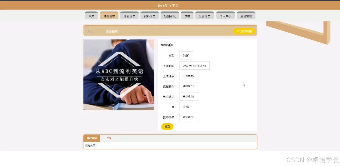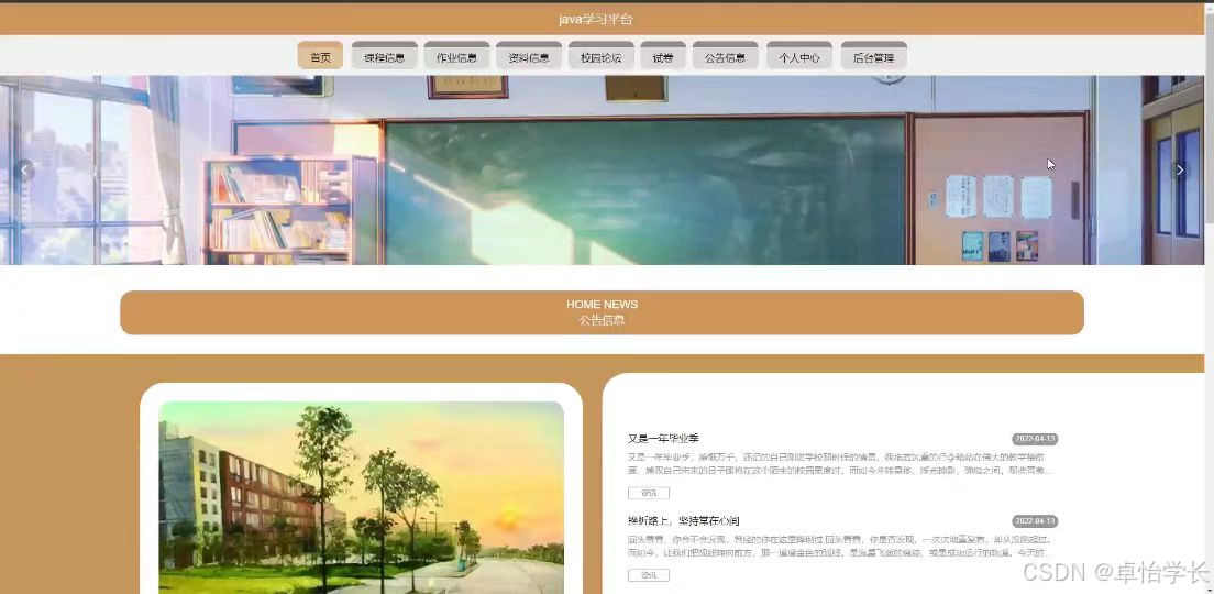 本次设计任务是要设计一个学习平台,通过这个系统能够满足学习信息的管理及学生和教师的学习管理功能。系统的主要功能包括首页,个人中心,学生管理,教师管理,课程信息管理,类型管理,作业信息管理,资料信息管理,签到信息管理,成绩统计管理,学生作业管理,试卷管理,试题管理,校园论坛,系统管理等功能。