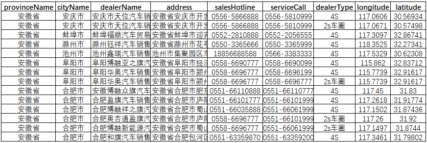 fields = ["provinceCode", "provinceName", "cityName", "dealerName", "dealerShortName","address", "salesHotline", "serviceCall", "dealerType", "businessType","shopType", "salesRegionName", "dealerCode", "longitude", "latitude"
