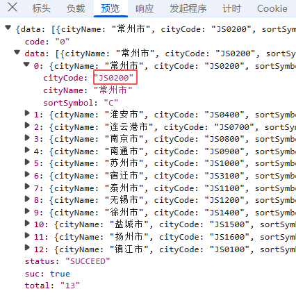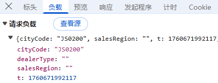 负载:对于POST请求:负载通常包含了传递的参数,因为所有参数都通过URL传递,这里我们可以看到查询关键词,cityCode(地级行政区编码),时间戳等标签,没有进行加密;