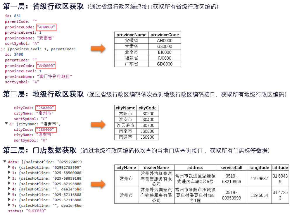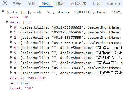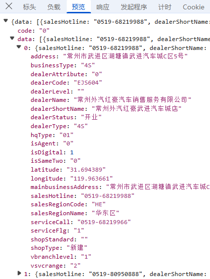 获取数据标签如下,provinceName(省份行政区名称)、cityName(地级行政区名称)、address(门店地址)、salesHotline(销售电话)、serviceCall(服务电话)、dealerType(门店类型)、lng & lat(地理坐标),其他一些非关键标签,这里省略;