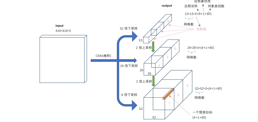 检测头 | 每个网格预测2个框(4坐标+1置信度+20类别) | 每个网格预测5个框(锚框机制) | 每个网格预测3个框(9锚框分3尺度) |