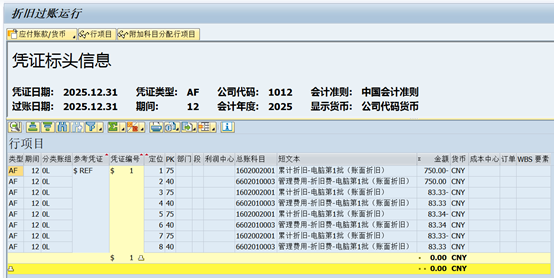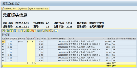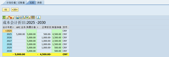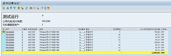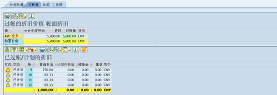 【过账值】标签页展示了今天剩余月份的折旧计划。