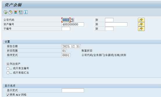 会计核算-->财务会计-->固定资产-->信息系统-->资产会计报表-->资产余额-->资产清单-->资产余额-->S_ALR_87011963 - ... 按资产编号