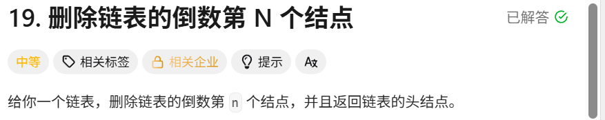 class Solution:def removeNthFromEnd(self, head: Optional[ListNode], n: int) -> Optional[ListNode]:left = right = dummy = ListNode(next=head)for _ in range(n):right = right.nextwhile right.next:left = left.nextright = right.nextleft.next = left.next.nextreturn dummy.next