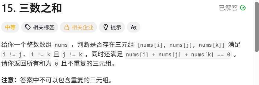 class Solution:def threeSum(self, nums: List[int]) -> List[List[int]]:nums.sort()ans = []for i in range(len(nums) - 2):if nums[i] > 0: breakif i > 0 and nums[i] == nums[i-1]: continuel, r = i + 1, len(nums) - 1while l < r:s = nums[i] + nums[l] + nums[r]if s < 0:l += 1while l < r and nums[l] == nums[l-1]: l += 1elif s > 0:r -= 1while l < r and nums[r] == nums[r+1]: r -= 1else:ans.append([nums[i], nums[l], nums[r]])l += 1r -= 1while l < r and nums[l] == nums[l-1]: l += 1while l < r and nums[r] == nums[r+1]: r -= 1return ans